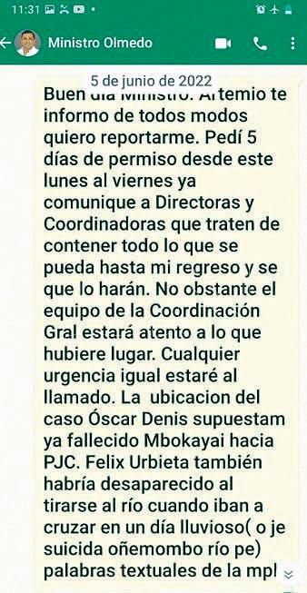 La ex alta funcionaria del Ministerio de Justicia mos tró mensajes de Whatsapp donde se le informa al ex ministro de esa cartera, Édgar Olmedo, la supuesta ubicación donde se encuen tra enterrado el cuerpo de don Óscar Denis, una comunidad indígena en el departamento de Amam bay. Desde el Poder Ejecu tivo, como era de esperarse, salieron prontamente a des mentir tal cuestión. Una vez más, el vocero fue Federico González.