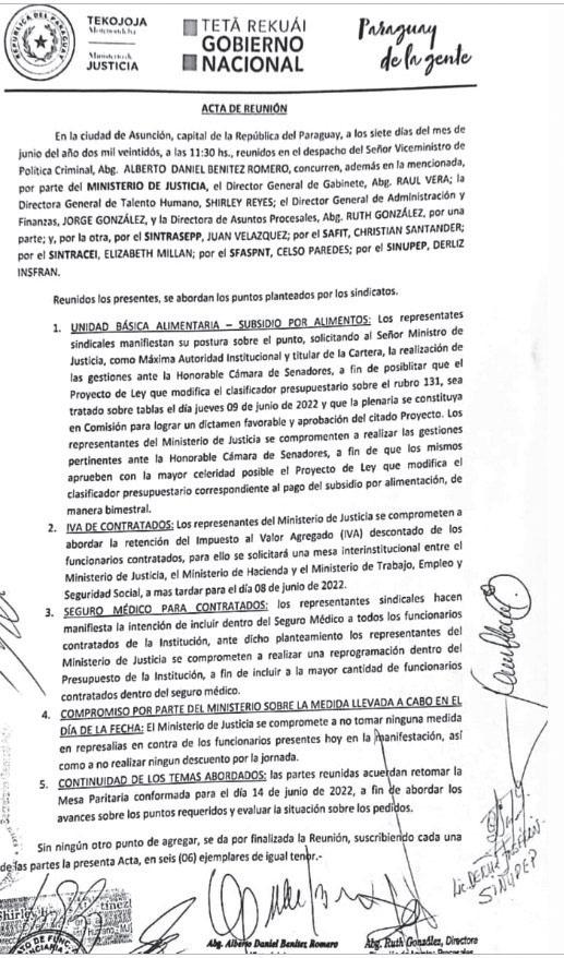 Todo empezó con el proyecto presentado por el diputado Arnaldo Samaniego y acom pañado por el ministerio, que consistió en la modificación del clasificador presupuesta rio para habilitar que el sub sidio por alimentación de G. 1.700.000 otorgado de forma bimestral se pueda repartir a todo el funcionariado de Jus ticia. La Ley Nº 6944 fue pro mulgada el 8 de julio del 2022.