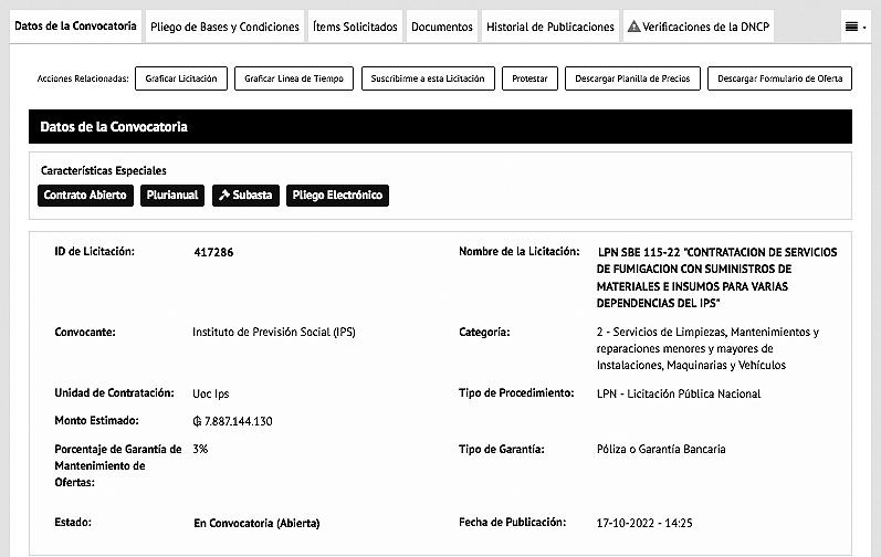En medio de constantes protestas por malos manejos administra tivos, el Instituto de Previ sión Social (IPS) está detrás de una licitación para la “Contratación de servicios de fumigación con suminis tros de materiales e insumos para varias dependencias del IPS” por un total de G. 7.887 millones, un poco más de US$ 1 millón.
