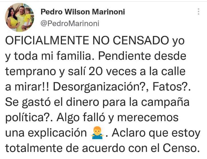 “Excepto por este inconve niente que tuvimos, pero con final feliz. Ya se recuperó el teléfono de la compañera. Un empresario de la zona se com prometió a darle un teléfono nuevo”, expresó Luis Echeve rría, jefe departamental del Censo Nacional 2022.