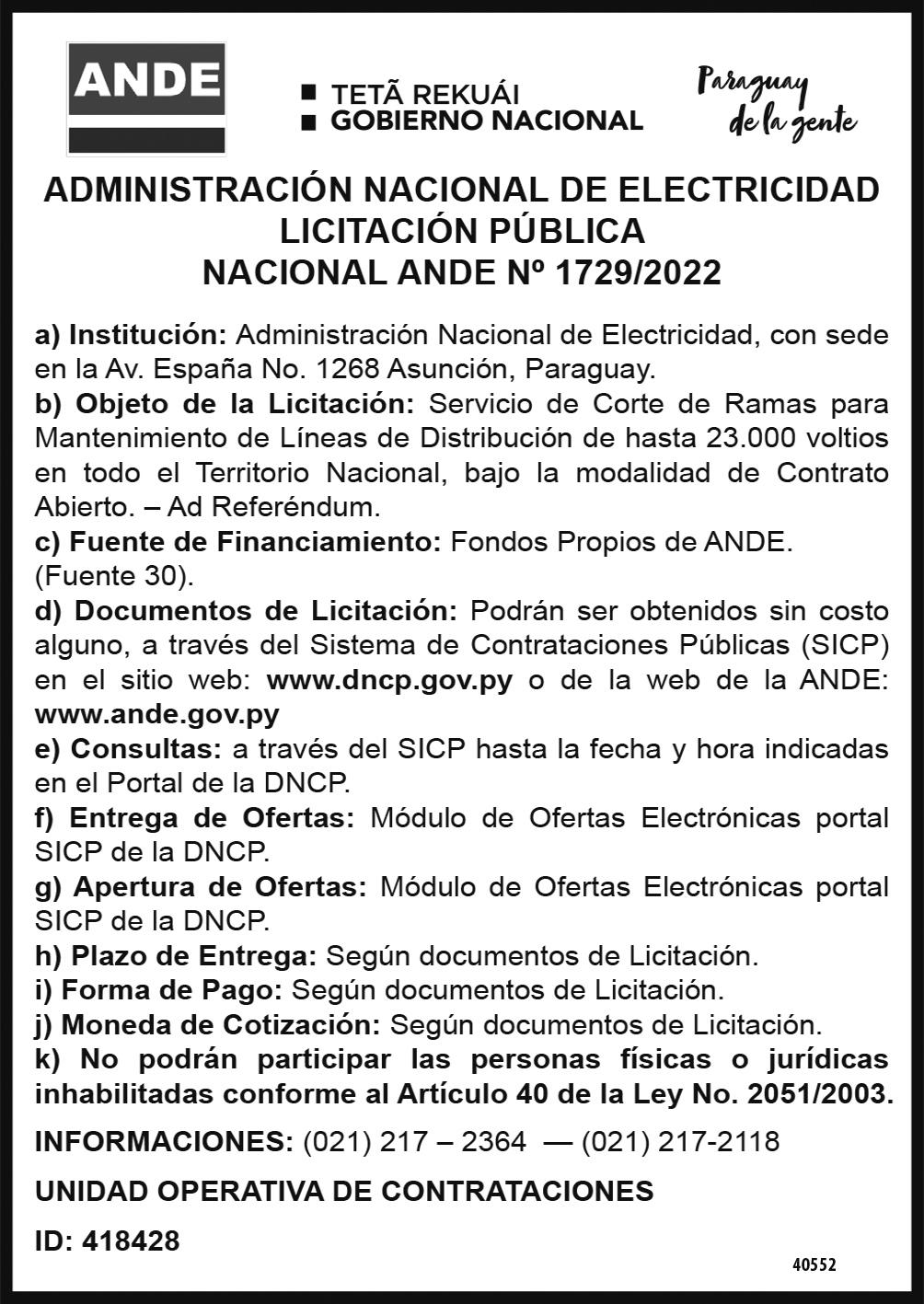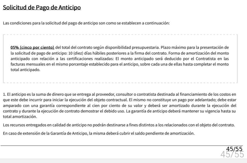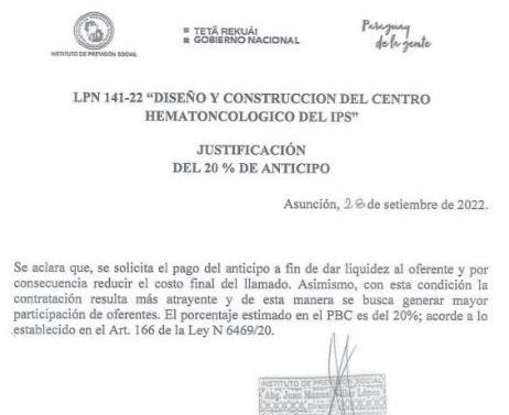 Lo que olvidaron mencio nar es que el documento que citaron no se encuentra publicado junto a los otros documentos de la licitación que obran en el portal de la Dirección Nacional de Con trataciones Públicas (DNCP). Sin embargo, el anticipo del 20% es lo que fue publicado en el llamado.