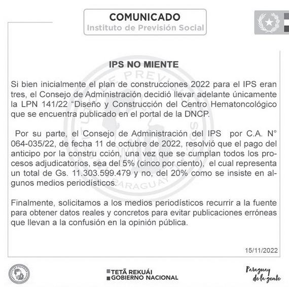 Através de la Unidad de Investigación de Nación Media se expuso cómo el Instituto de Previsión Social (IPS) min tió sobre el pago del anticipo para la construcción de un hospital hemato-oncoló gico. Desde la previsional afirman que el anticipo de la obra es del 5%, equivalente a G. 11.303 millones, pero los documentos demuestran que ya se justificó el desem bolso del 20%, llegando a más de G. 45.214 millones.