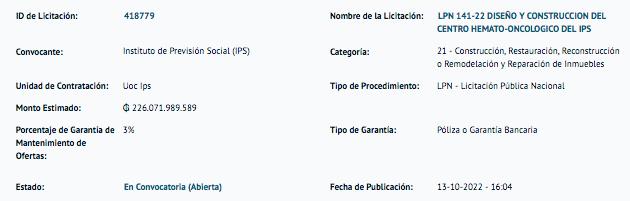 Hay que recordar que, el 7 de noviembre del 2022, el Ins tituto de Previsión Social había publicado en el portal de Contrataciones Públicas el “Diseño y construcción del centro hemato-oncológico