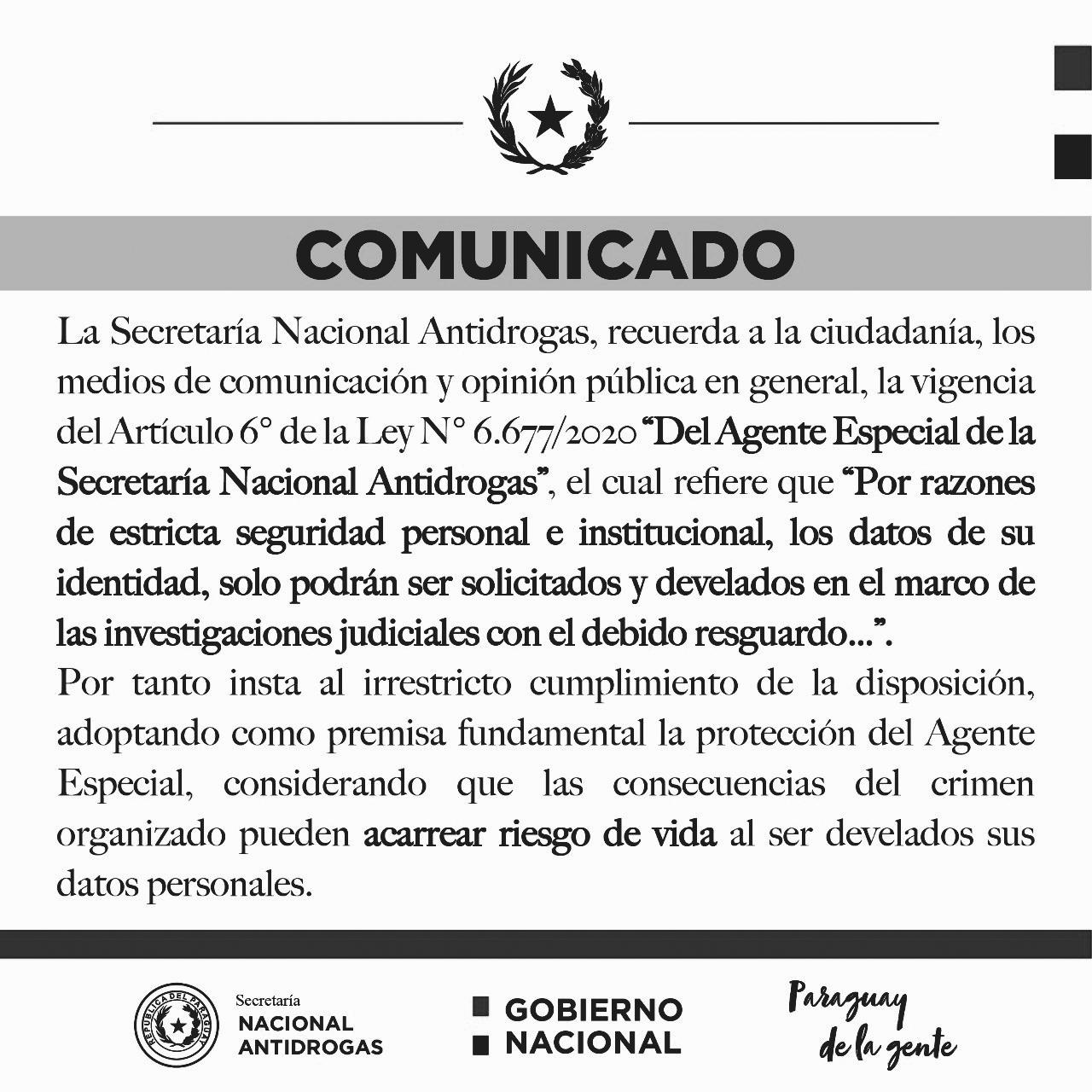 El comunicado de la secre taría cita el artículo 6º de la Ley 6677/2020, pero solamente hace referencia a que las identidades de los investigadores no podrán ser reveladas, obviando que remarca que deberá darse en el marco de una investigación.