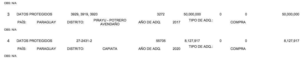 Pero, siguiendo con la “suerte” de Valdez, en su última decla ración de agosto de este año adquirió un terreno de 360 metros cuadrados por tan solo G. 5 millones, y que se encuen tra ubicado en la localidad de Minga Guazú. El pequeño detalle es que este inmueble figura en Catastro a nombre