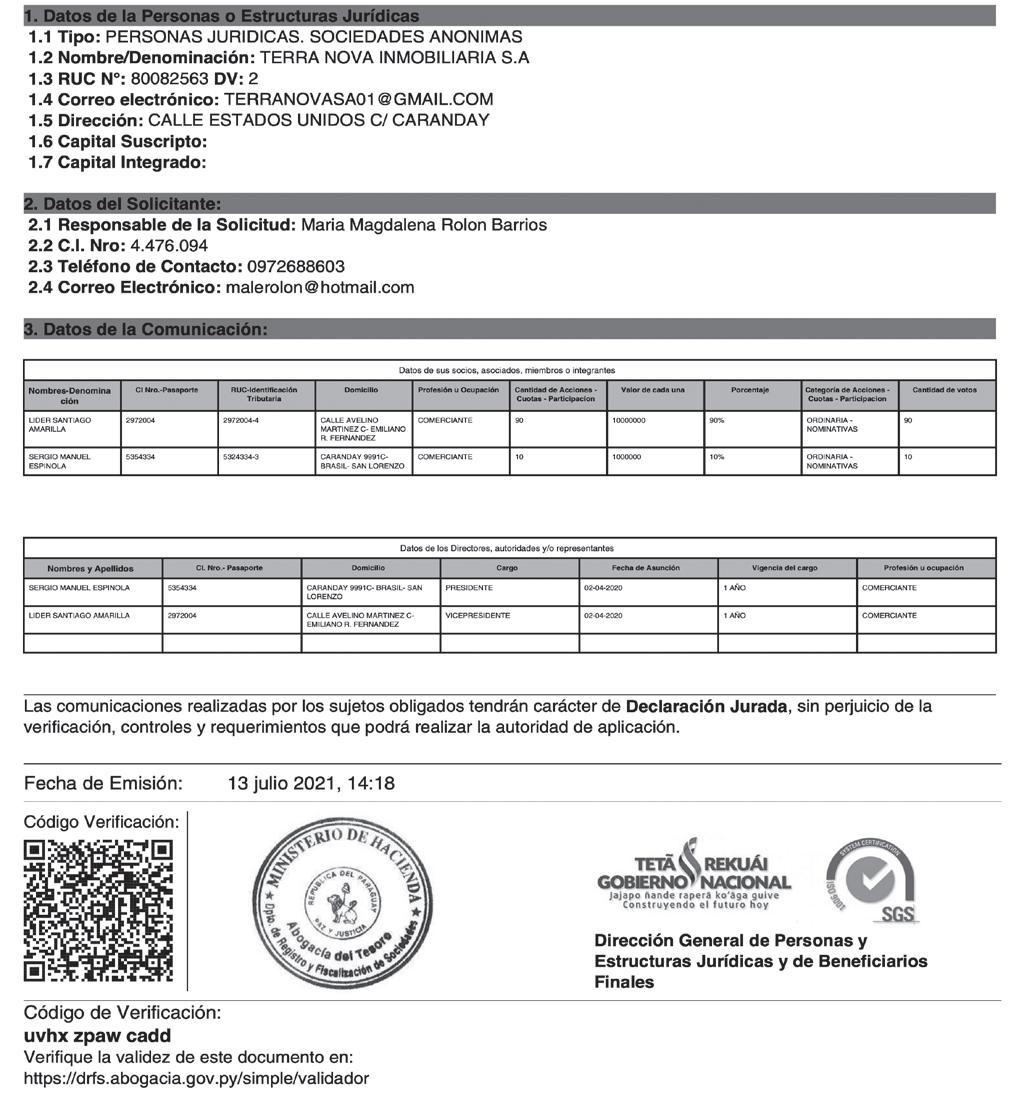 Renán Leguizamón Garcete, funcionario del Instituto de Previsión Social (IPS), aparece también como vicepresidente de Terranova Inmobiliaria SA en algunos años y Adrián Leith Calonga, un modesto sereno con sueldo de G. 2.200.000 en el Ministerio de la Defensa Pública, a quien se le atribuye firmas en varias asambleas societarias como secretario.
