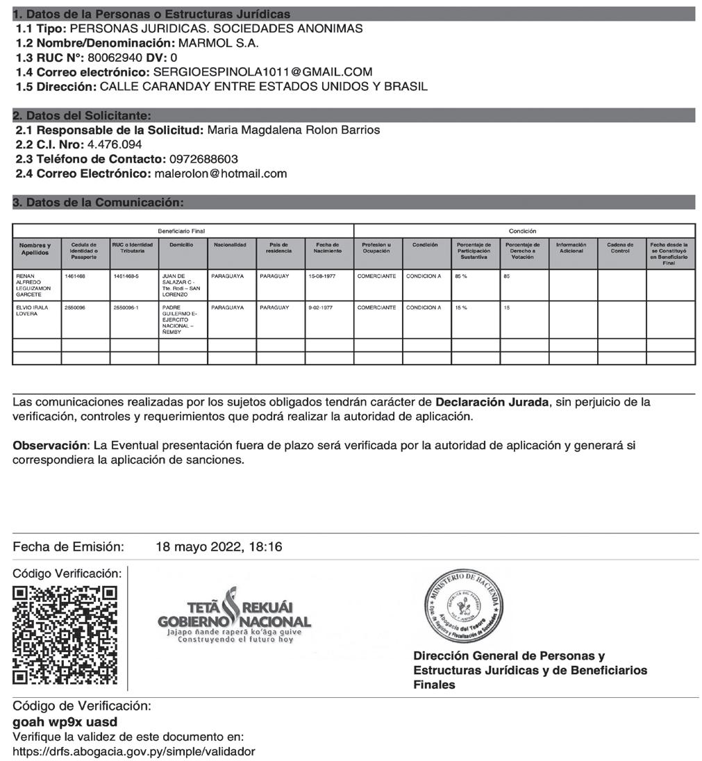 Sergio Manuel Espínola Villalba, primo del senador liberal que el mismo había contratado como chófer cuando fue intendente de la Municipalidad de Villa Elisa, registra el 10 % de las acciones y alternaba cargos de vicepresidente y presidente en la inmobiliaria. Actualmente es funcionario