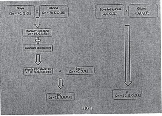 introducen en la soya. Anteriormente, la introgresión exitosa requería amplias polinizaciones de cruzamiento divergente, rescate embrionario y regeneración de brotes F1. Además, se requirió la duplicación de cromosomas, que se puede lograr mediante el tratamiento químico de los embriones, para obtener anfidiploides fértiles (F1D). A continuación se requirió un retrocruzamiento con soya para obtener la genética BC1F1. Aquí se describen procedimientos mejorados para cruces interespecíficos entre soya y Glycine tomentella. Estos procedimientos ofrecen una ruta más eficiente a la genética BC1F1 al evitar la generación anfidiploide. Estos principios se pueden aplicar a especies domésticas adicionales y a sus parientes silvestres tales como Brassica. Farm. Berta Segovia, Directora Interina –Dirección de Patentes. 11/06 -
