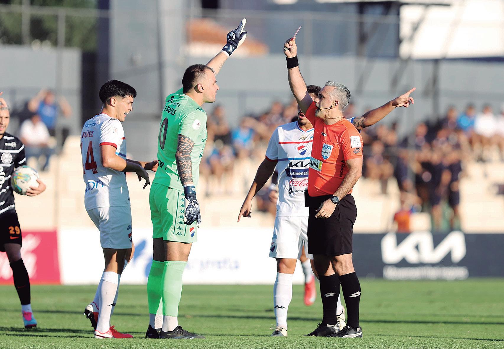 El árbitro Carlos Paul Benítez le exhibe la tarjeta roja al arquero Santiago Rojas