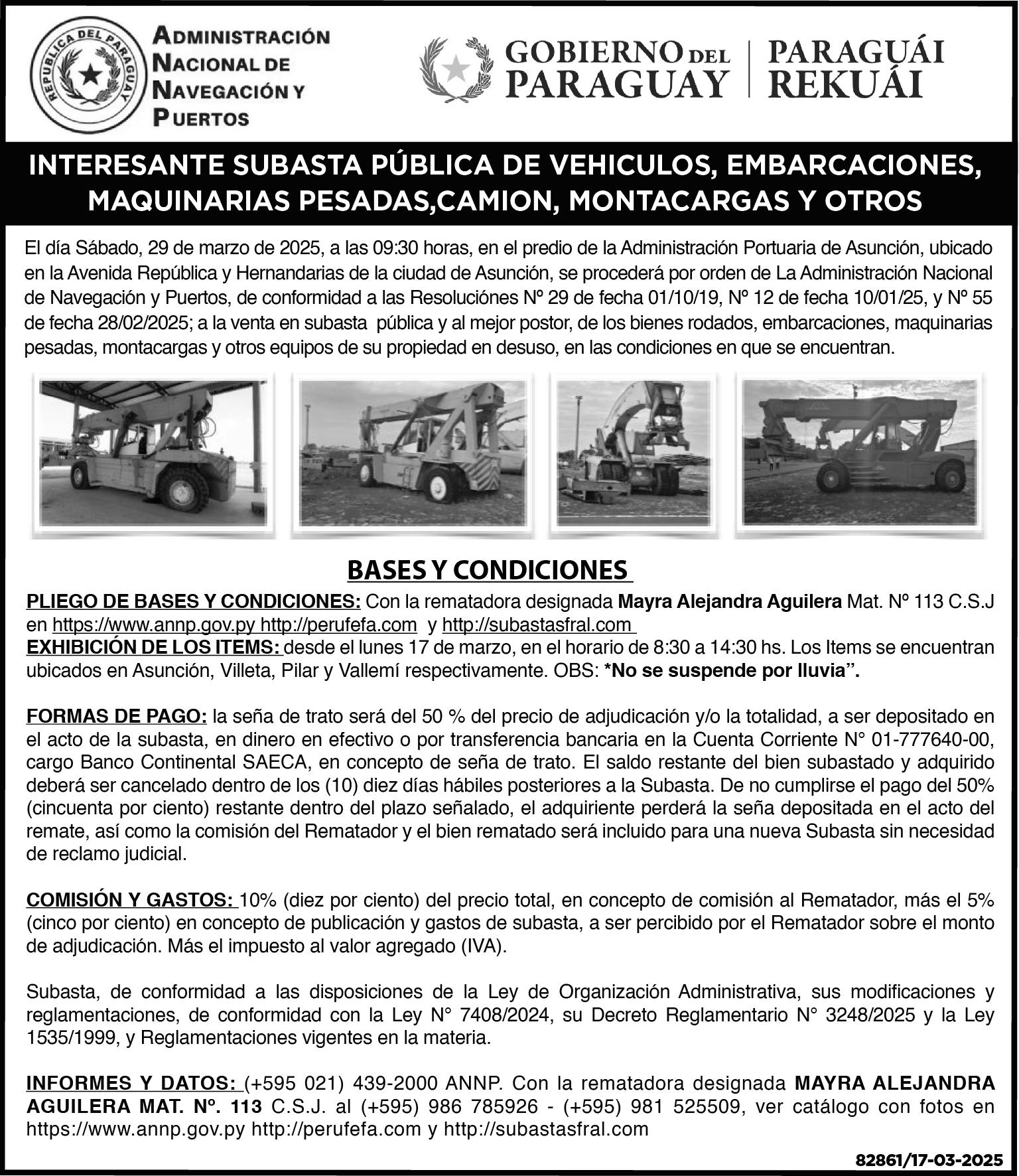 en el local de la secretaria del juzgado donde se tramita el citado juicio, en horas de oficina y atención al público, de 07:00 a 13:00 hs., el comprador abonará en el acto el 10%, del valor de la Adjudicación en concepto de seña, en dinero efectivo, costos de publicación del diario, viático del actuario Judicial. (Acordada 516 de la C.S.J.), y el 2% comisión de Rematador Público V° B° de la Abg. Nélida Pereira Vera. Actuaria Judicial. Ana Bella Goiris. Rematador Público. Mat. N° 22 AR. Hernandarias. Telf. 0981-112982. 82560 -16/03/2025-