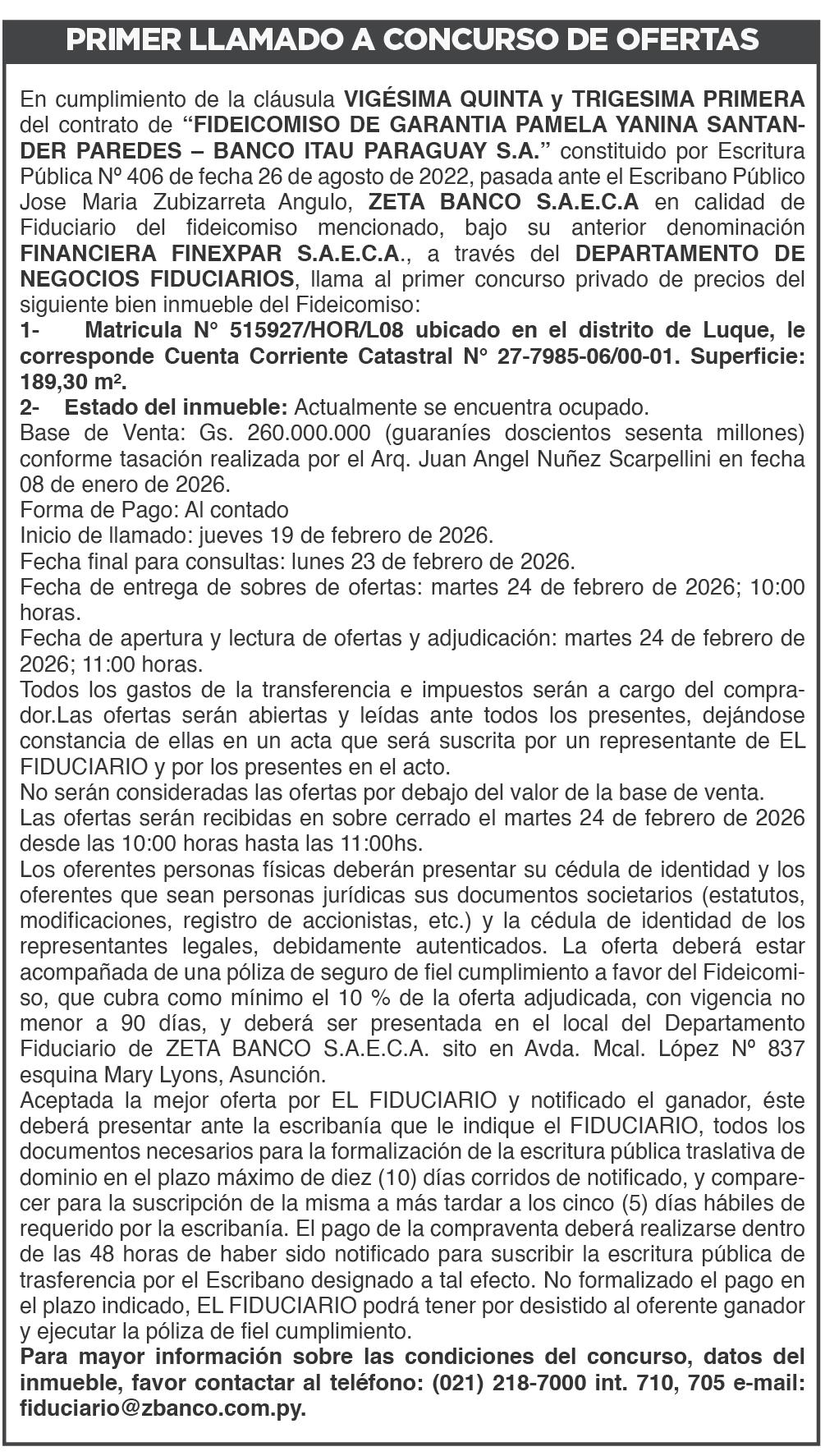 A realizarse el día 06 de marzo del 2026 a las 10:00 horas en su local situado Valeriano Zeballos e/Maestro Félix y Mcal Estigarribia de la ciudad de Luque, a los efectos de tratar los siguientes puntos Orden del Día. 1- Asignación de un Secretario de Asamblea. - 2- Lectura y consideración de la memoria del Directorio, Balance General, Cuadro de Resultados e informe del Síndico correspondiente al ejercicio cerrado al 31 de diciembre de 2.025. 3- Designación de Directores por 1 (un) año y del Síndico Titular y Suplente por 1 (un) año y sus remuneraciones. - 4- Consideración del resultado del Ejercicio 2025. 5- Designación de un Accionista que deberá firmar el Acta de Asamblea conjuntamente con el Presidente y Secretaria.Se recuerda a los señores accionistas las previsiones establecidas en el Art. Décimo Séptimo de los Estatutos Sociales para poder asistir a la asamblea. Daniel Dario Mautone Representante Legal/ 100012- 22/02/2026