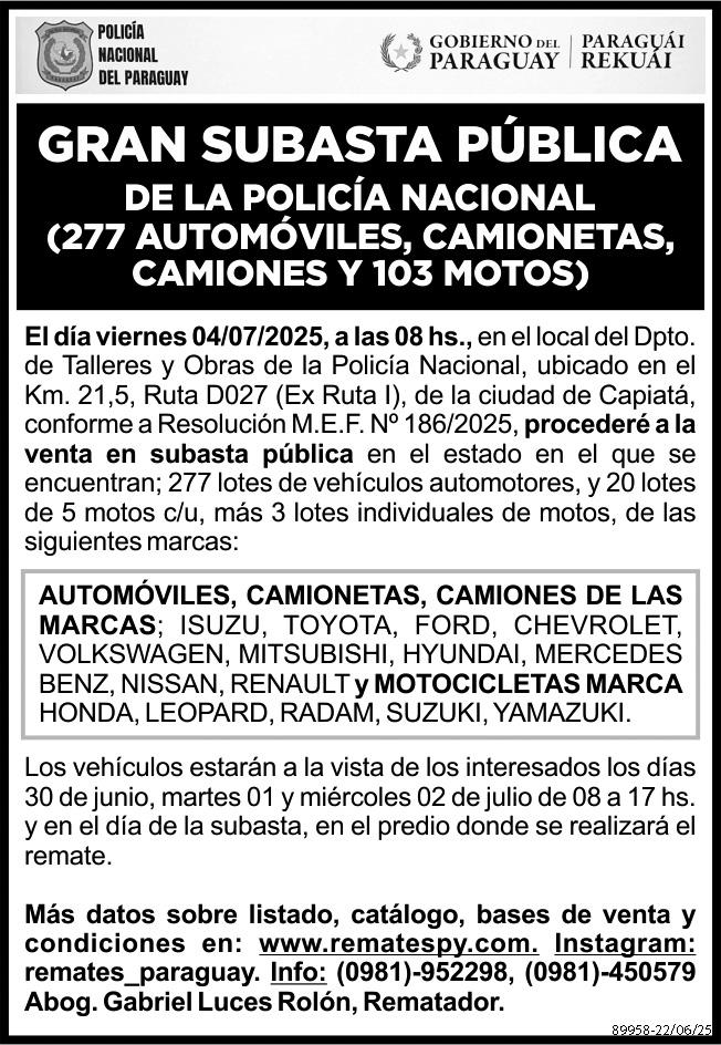 1-Elección de un presidente de Asamblea y un secretario/a de Asamblea 2- Designación de dos Socios para firmar el Acta de Asamblea, con el presidente y el secretario/a. 3-Considerar el Balance General cuentas de Gastos y recursos: Memoria del Órgano Directivo, Informe de la Junta Fiscalizadora. 4-Asuntos Varios. Ciudad del Este, junio de 2025. Consejo Directivo. 89907- 20 al 22/06