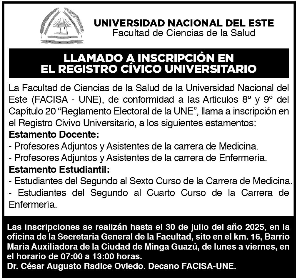 horas en primera convocatoria, y a las 10:00 horas en segunda convocatoria, en el local social, sito en la Avenida José Asunción Flores, Edificio Toscanas, Urbanización Paraná Country Club de la ciudad de Hernandarias, departamento de Alto Paraná, República del Paraguay, para some¬ter a su examen y consi-deración, el siguiente orden del día: 1- Designación del Presidente y Secretario de la Asamblea. 2- Lectura y Consideración de la Memoria del Directorio, Balance General, Estados Financieros e Informe del Síndico, Cuentas de Ganancias y Pérdidas, créditos y deudas de accionistas, distribución de utilidades, si las hubiere, correspondiente al ejercicio cerrado al 31 de diciembre de los años 2024. Destino del resultado del ejercicio 2024. 3- Elec¬ción de Directores y Síndicos. 4- Determinación y fijación de las remuneraciones de Directores y Síndicos. 5Designación de accionistas que deban suscribir el Acta de Asamblea. NOTA: Se recuerda a los Señores Accionistas que para asistir a las Asambleas deben depositar en la sociedad sus acciones, certificado provisorio de acciones, o un certificado bancario de depósito librado al efecto, para su registro en el libro de registro de asistencia de accionistas a asambleas, con no menos de tres días hábiles de anticipación al de la fecha fijada. En dicho lapso no podrán disponer de ellas. La Sociedad le entregará los documentos necesarios de recibo, que servirán para la admisión a la asamblea, conforme al Art. 31° de los estatutos sociales y del Art. 1.084 del Código Civil. Hernandarias, 13 de Mayo de 2025. EL DIRECTORIO. 88460 -28/05/2025