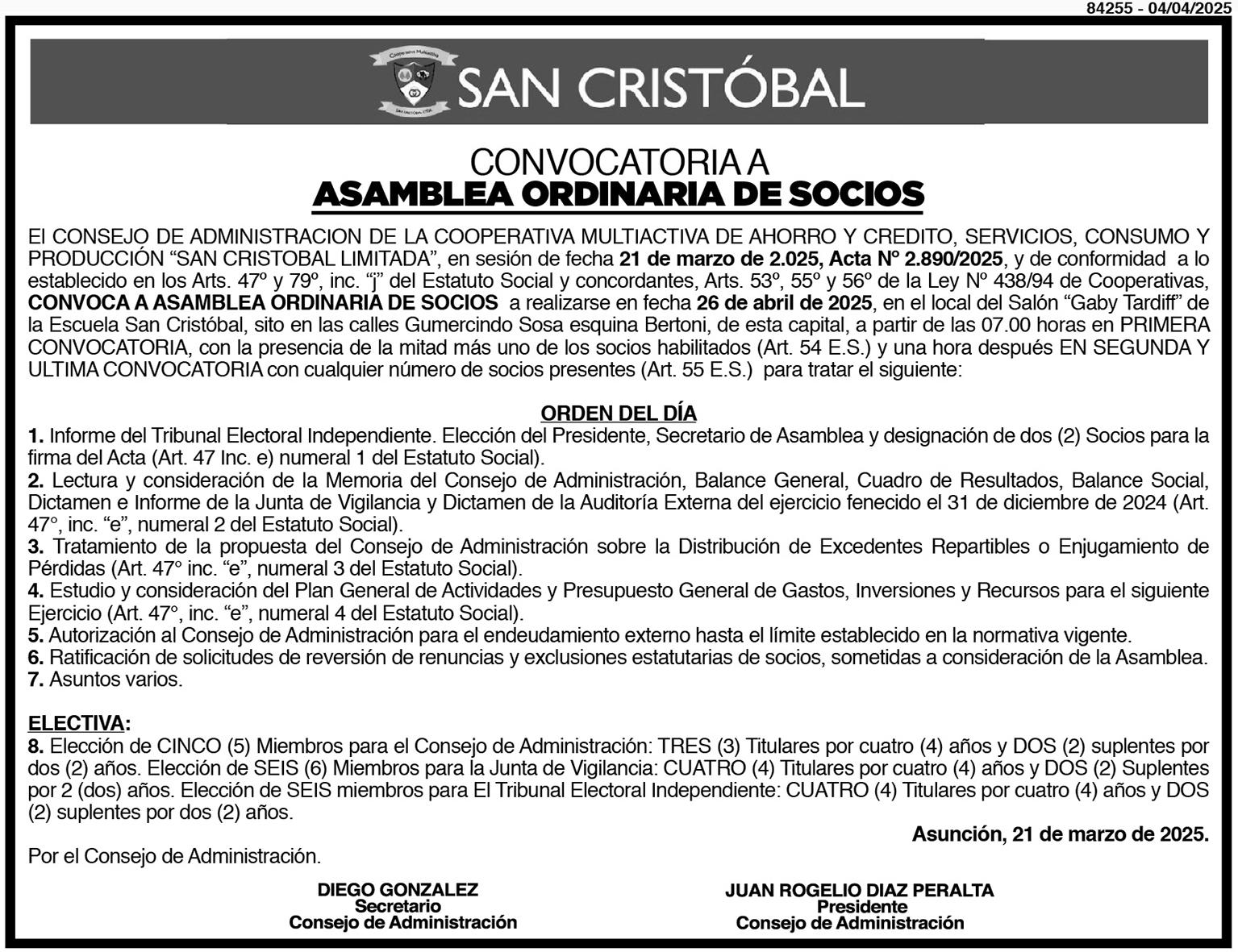 rería de la Sociedad con hasta 3 días de anticipación. EL DIRECTORIO Asunción, marzo del 2025- OP 84191-5/04/2025