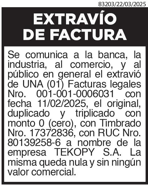 CONVOCATORIA A ASAMBLEA GENERAL EXTRAORDINARIA DE ACCIONISTAS GRUPO F9 S.A. RUC № 80131020-2 El Directorio de GRUPO F9 S.A., de conformidad con lo dispuesto en el Código Civil y los Estatutos Sociales, convoca a Asamblea General Extraordinaria de Accionistas para el día miércoles, 2 de abril de 2025 a las 08:00 horas, en primera convocatoria, y una hora después en segunda convocatoria, a realizarse en el local social sito en Alberdi entre Sicilia y Roma Nro. 1507 de la ciudad de Asunción para tratar el siguiente: ORDEN DEL DIA 1-Designación de un Presidente y Secretario de Asamblea. 2-Modificación de Estatutos Sociales. 3-Designación de los accionistas para firmar el acta de asamblea de conformidad con el Art. 1096 del Código Civil. NOTA. Se recuerda a los señores accionistas, depositar con 3 (tres) días hábiles de anticipación a la Asamblea, sus títulos accionarios o certificados de depósito de los mismos, conforme lo establecen el artículo 1084 del Código Civil y el Estatuto Social. EL DIRECTORIO- OP 8294421/03/2025