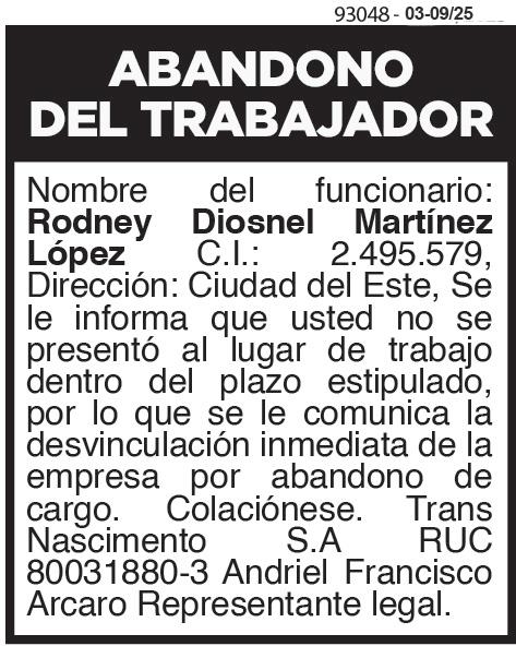 ASAMBLEA GENERAL ORDINARIA. AGROBUSINESS DEL PARAGUAY SOCIEDAD ANÓNIMA c onvoca a Asamblea General Ordinaria a llevarse a cabo el día 12 de Setiembre de 2.025, a las 16:00 horas, sito en San José Fracción Macarena, Ciudad del Este, Departamento del Alto Paraná orden del día: 1 - Designación del presidente y secretario de la Asamblea. 2 - Emisión de Nuevas Acciones, canje de las acciones anteriores 3Designación de un accionista para firmar el acta de asamblea. El Directorio. 93274- 2 al 6/09 A