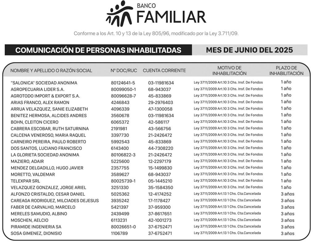 CONVOCATORIA A ASAMBLEA GENERAL ORDINARIA DE ACCIONISTAS GRUPO HENDY S. A. RUC 80082125-4. El Directorio de GRUPO HENDY S.A con domicilio de la ciudad de Avda. Santa Teresa entre Aviadores del Chaco y Herminio Maldonado, Paseo La Galería, Torre 3, Piso 11, convoca a los señores Accionistas a Asamblea General Ordinaria a desarrollarse en forma presencial el día 30 de julio de 2025, a las 10:00 horas y a las 11:00 horas, en primera y segunda convocatoria respectivamente, en la que, previa acreditación de asistencia y representación, se tratarán los siguientes puntos del Orden del día: 1-Designación de Presidente y Secretario de la Asamblea. 2- Designación de los miembros del Directorio, del Síndico Titular y Suplente, y fijación de sus respectivas remuneraciones. 3- Designación de accionistas para firmar el acta de asamblea de conformidad con el Art. 1.096 del Código Civil. Para asistir a las asambleas los accionistas deben depositar en la sociedad sus acciones, o un certificado bancario de depósito librado al efecto, para su registro en el libro de asistencia a las asambleas, con no menos de tres (3) días hábiles de anticipación al de la fecha fijada. En dicho lapso no podrán disponer de ellas. La sociedad les entregará los comprobantes necesarios de recibo, que servirán para la admisión a la asamblea. Los accionistas o sus representantes que concurran a la asamblea firmarán el libro de asistencia en el que se dejará constancia de su domicilio y del número de votos que corresponda. Los cer-