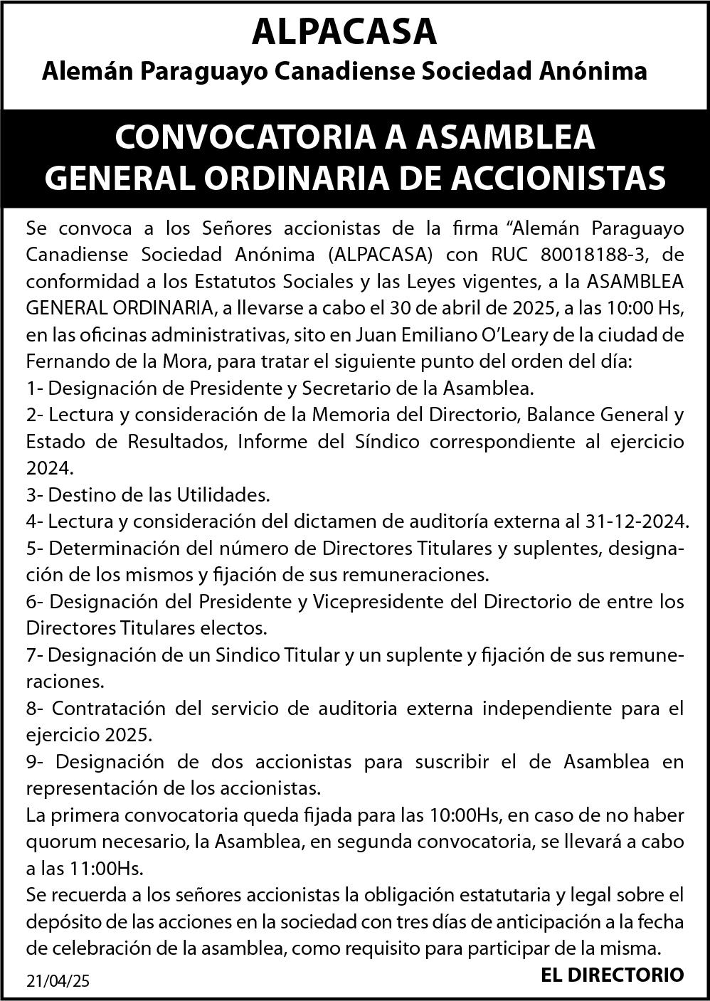 S.A., para el 25 de Abril de 2025 a las 10:00 hs en el local social de Fulgencio Yegros N° 990, Luque, con el objeto de considerar el siguiente: ORDEN DEL DIA 1) Elección de Presidente y Secretario de Asamblea. 2) Lectura y consideración de la Memoria del Directorio, Balance General, Cuadro de Resultados e Informe del Síndico correspondiente al ejercicio cerrado al 31 de Diciembre del 2024. 3) Destino del resultado. 4) Elección del Directorio. 5) Elección de Síndicos. 6) Fijación de Remuneración de Directores y Síndico. 7) Designación de dos accionistas para suscribir el Acta de Asamblea. EL DIRECTORIO. 8595417/04/2025.
