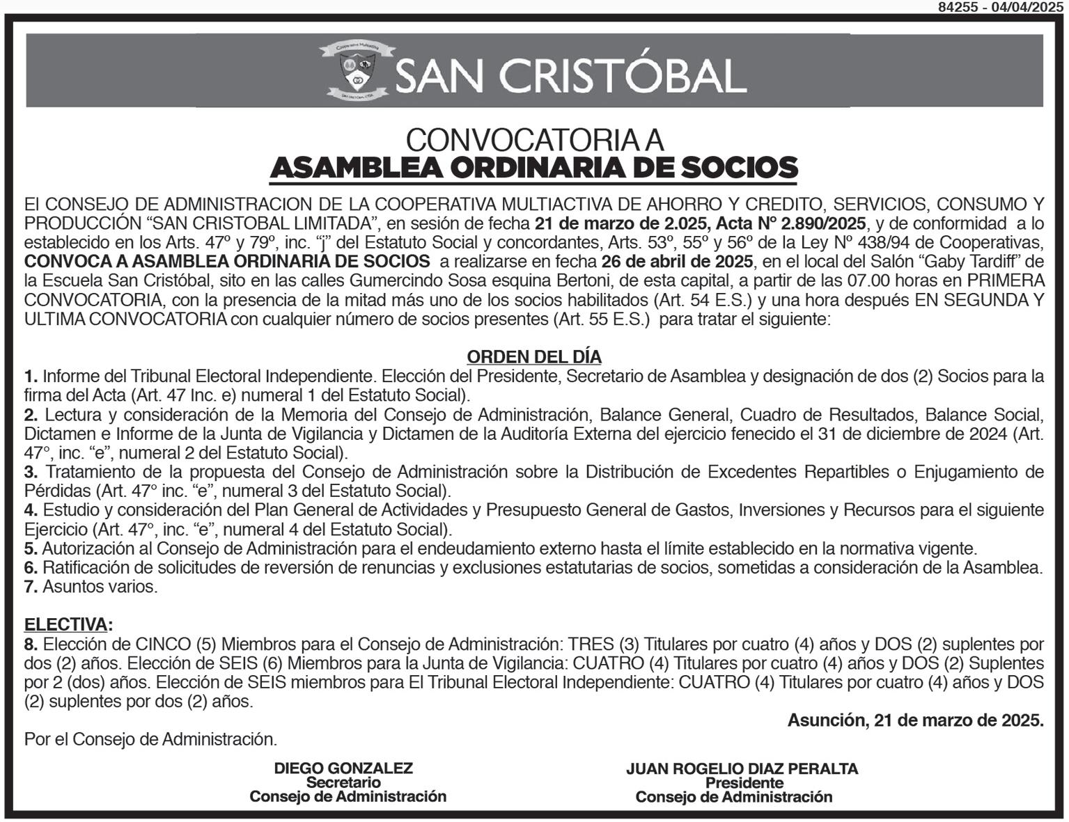 forme lo establecido en los Estatutos Sociales; convoca a sus asociados a Asamblea General Ordinaria a realizarse en la sede social ubicada en el Distrito de Corpus Christi, Departamento de Canindeyú, el día, viernes 25 de abril del 2025, a las 09:00 hs. para tratar el siguiente orden del día: 1-Elección de un presidente y un secretario de asamblea. 2-Lectura y consideración de la Memoria del Directorio, Balance General, Cuadro Demostrativo de Pérdidas y Ganancias e Informe del Síndico, correspondientes al ejercicio económico cerrado al 31 de diciembre del 2024. 3-Elección de autoridades y remuneraciones a acordar a los señores directores y Síndicos. 4-Consideración de resultados. 5-Otros asuntos de interés. 6-Elección de dos accionistas para firmar el acta conjuntamente con el presidente y secretario de asamblea. El Directorio. 84266- 5/04/2025