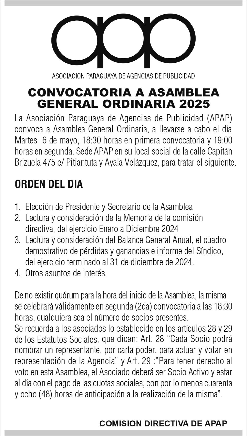 establecido en los Arts. 34 y 36 de los Estatutos Sociales, el Consejo Directivo, en base al Art. 24 inc. “g” de los Estatutos Sociales, convoca a los asociados a la Asamblea General Ordinaria para el día Miércoles 30 de abril de 2025 a las 19:00 horas en primera convocatoria, y en su defecto a las 19:30 en segunda convocatoria en su Sede Social sito en World Trade Center de la ciudad de Asunción a fin de tratar los siguientes puntos del Orden del Día: 1. Lectura y Aprobación de la Memoria, Inventario, el Balance General, el Estado de Resultado y el Informe del Síndico correspondientes al Ejercicio del año 2024. 2. Elección de miembros de la Comisión Directiva y Síndicos. 3. Elección de dos asociados presentes para la firma del acto de la Asamblea junto al presidente y secretario de la misma. El Consejo Directivo. OP 86442- 26/04/2025