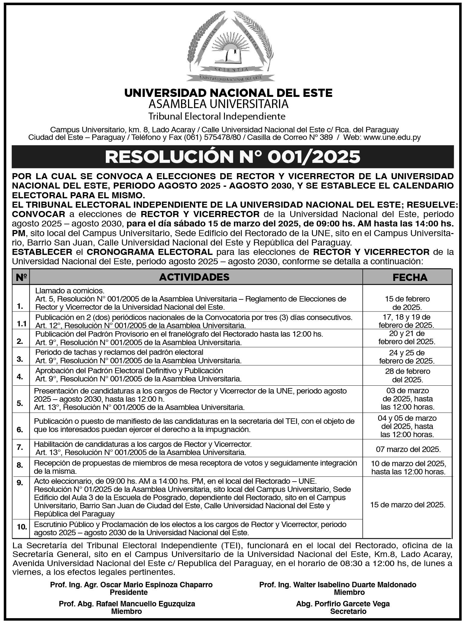 Hernandarias, Departamento del Alto Paraná, el día lunes 10 de marzo del 2025, a las 08:00 hs. en primera convocatoria y a las 09:00 horas en segunda convocatoria para tratar el siguiente orden del dia: 1-Elección de un presidente y un secretario de asamblea. 2-Apertura de la Asamblea Ordinaria por el presidente del Directorio de la Sociedad.