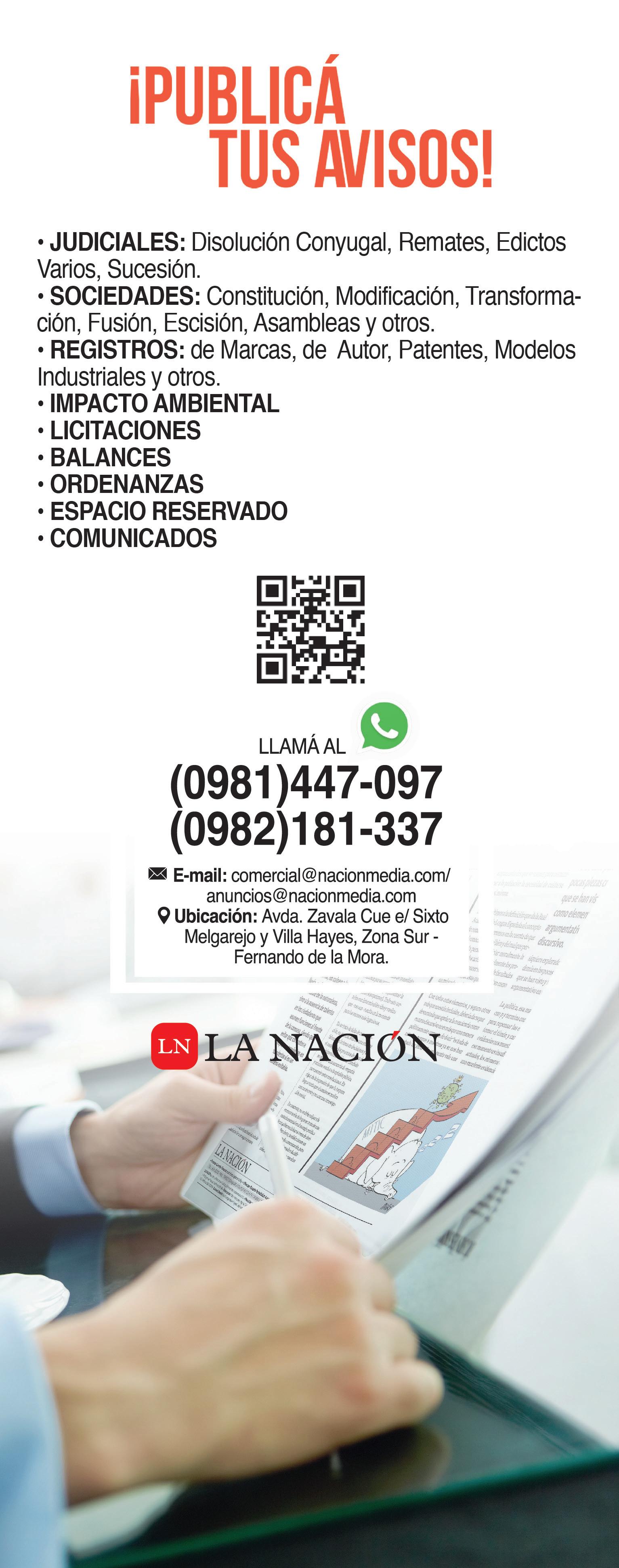 SUCESIÓN. La Jueza de Primera Instancia en lo Civil y Comercial del Vigésimo Cuarto Turno, Dra. Magalí Zavala cita y emplaza por sesenta días a herederos y acreedores de la *sucesión de NINFA MERCEDES NOGUERA. El juicio radica en la Secretaría 48 a cargo del Actuario Judicial Carlos Galeano Aranda. Asunción, 20 de marzo de 2025 Se hace saber al destinatario de este Edicto que el mismo cuenta con el Código QR, por lo cual, para tener certeza de que este documento es válido, deberá utilizar el lector del Código QR, siendo ya en consecuencia innecesaria la autenticación manual del Actuario del Juzgado, conforme Acordadas 1366/2019 y 1370/2020 de la Excma. Corte Suprema de Justicia OP 83521.2/04/2025.