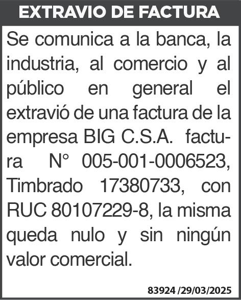 lunes 31 de marzo de 2.025 en el local social de la firma, sito en la avenida Carlos A. López Ciudad del Este, con el objeto de considerar el siguiente, orden del día: 1-Lectura y consideración de la memoria del directorio, balance general, estado de resultado, estado de flujo de efectivo, estado de variación del patrimonio neto, y anexo, de informe del síndico correspondiente al ejercicio económico cerrado el 31 de diciembre de 2024. 2-Elección de miembro del directorio y síndico titular para el año 2.025, y sus remuneraciones. 3-Destino de las utilidades. 4-Designación de accionistas para suscribir el acta, juntamente con el presidente y secretario de asamblea. NOTA: Se recuerda a los Señores Accionistas lo dispuesto en los Artículos Nº 1.084 y 1.085 del Código Civil y el Artículo Nº 26 de los Estatutos Sociales. EL Directorio. 83362 -25/03/2025ASAMBLEA GENERAL ORDINARIA. En cumplimiento de disposiciones legales vigentes, y de conformidad con lo prescrito por el Artículo Nº 23 de los Estatutos Sociales, el Directorio de PT SOCIEDAD ANÓNIMA convoca a los Señores Accionistas de la entidad a Asamblea General Extraordinaria de Accionistas para las 10:00 horas del día lunes 31 de marzo de 2.025 en el local social de la firma, sito en la Avenida Petirossi, Asunción, con el objeto de considerar el siguiente, orden del día: 1-Nombramiento de Secretario de Actas. 2-Disolución y Liquidación anticipada de la Sociedad por disposición de la Ley 6399, Resol.418. 3-Aprobación de la gestión del Liquidador de la Sociedad. 4-Designación de un accionista para realizar las gestiones relacionadas con su liquidación. El Directorio. 83363 -25/03/2025-