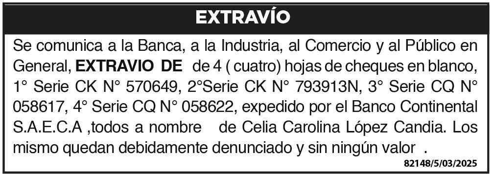 SUCESIÓN. La Juez de Paz en lo Civil, Comercial, Laboral, Niñez y Adolescencia y Penal de la ciudad de Sapucai, Abg y Esc. NILDA VICTORIA ÁLVAREZ ALVARENGA, CITA Y EMPLAZA en el diario La Nación por el término de sesenta días a los HEREDEROS Y ACREEDORES que se crean con derecho en la sucesión del causante " EMILIA LOPEZ " a presentarse por sí, a reclamar sus derechos los trámites se encuentran a cargo de este Juzgado. SAPUCAI, 21 de Febrero de 2024. Abog. Ever Rafael Florentin Ramirez –Actuario Judicial– OP 81969 - 8/03/2025
