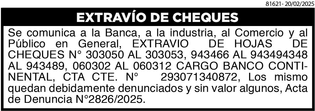 cos. En caso de falta de quórum en la primera convocatoria la segunda se realizará automáticamente una hora después. El Directorio recuerda a los Señores Accionistas sobre lo dispuesto por el Artículo 1084 del Código Civil Paraguayo. OP 81575- 23/02/2025.