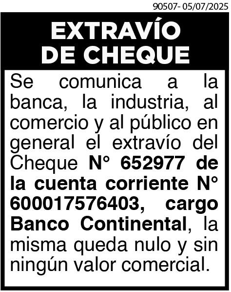 CONVOCATORIA A ASAMBLEA EXTAORDINARIA. El Directorio de PZP S.A. convoca a los accionistas a la Asamblea Extraordinaria para el día lunes 28 de julio de 2025, a las 12:00 hs., en primera convocatoria y una hora después en segunda convocatoria, en su local social ubicado en Isaac Kostianovsky 5630, Asunción, para tratar el siguiente ORDEN DEL DÍA: 1) Elección del Presidente y Secretario de la Asamblea; 2) Aprobación de las actuaciones del liquidador y el balance de clausura; 3) Cierre definitivo de la sociedad; y 4) Designación de accionistas para suscribir el Acta de Asamblea. EL DIRECTORIO. 90458 7/07/2025.