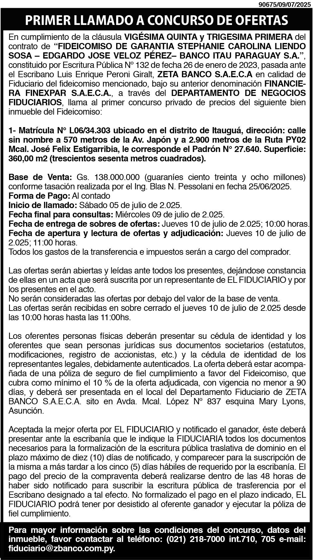 sores del Chaco casi Nueva Asunción Barrio San Juan de la ciudad de Fernando de la Mora, a objeto de tratar el siguiente Orden del Día: 1.- Elección de un presidente y secretario de la Asamblea. 2.- Consideración de la Memoria del Directorio, Balance General y Cuentas de Pérdidas y Ganancias, Estados de Flujo de Efectivo, Estado de Variación del Patrimonio Neto y la Determinación de la Utilidad Comercial por el Régimen Fiscal y el Impuesto a la Renta Empresarial “IRE”, con el informe del Sindico, correspondiente al ejercicio 2024. 3.- Destino de los Resultados del Ejercicio. 4.- Elección de los Miembros del Directorio para los ejercicios 2025/2026. 5.- Elección de Sindico Titular y Suplente. 6.-Fijación de Remuneración para los Miembros del Directorio y Síndico. 7.- Asuntos Varios 8.- Elección de dos Accionistas que deberán suscribir el Acta de la Asamblea. Liz Rocío Grütter Acevedo Presidente del Directorio- OP 90409- 6/07/2025.