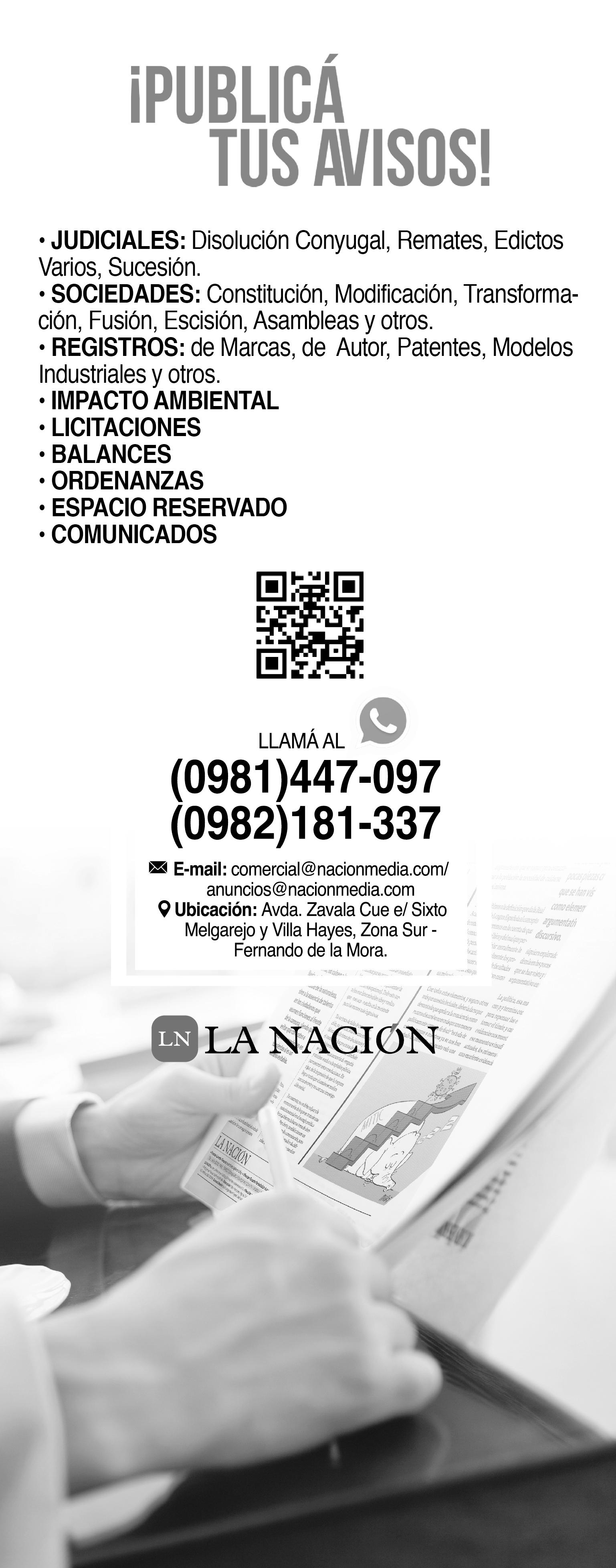 Anuncia con nosotros llamando al (021) 614 236 o escríbenos al e-mail: comercial@nacionmedia.com o anuncios@nacionmedia.com