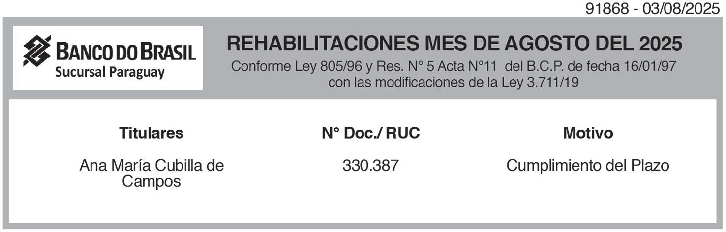 la firma del acta de Asamblea, juntamente con el Presidente y Secretario. Se recuerda a los señores Accionistas sobre las disposiciones referentes al Depósito de Acciones, según lo establecido por el Estatuto y Código Civil. Asunción, 27 JULIO 2025OP 91785- 3/08/2025