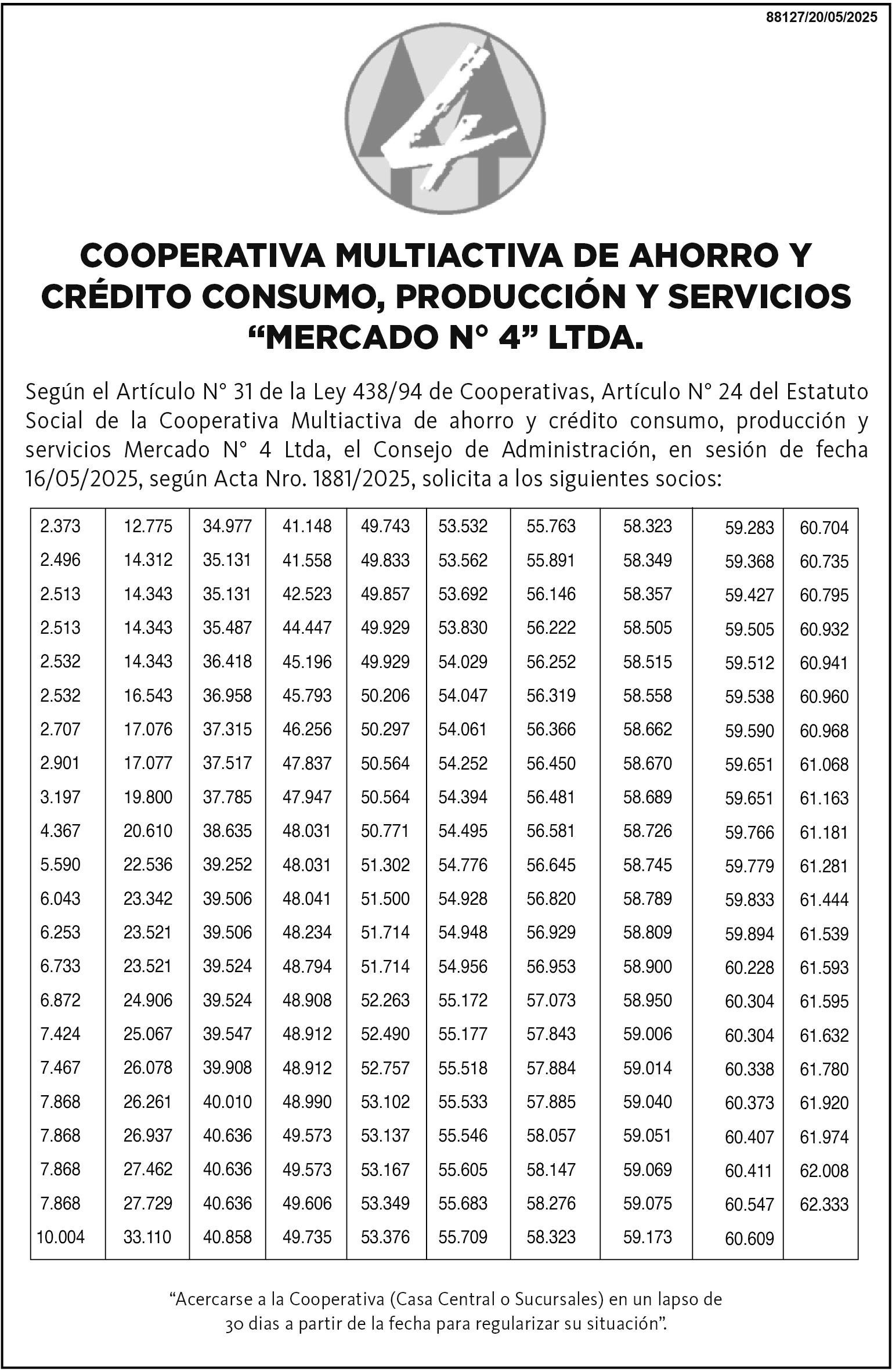 ALMISUR S.A.E. CONVOCATORIA A ASAMBLEA GENERAL ORDINARIA DE ACCIONISTAS. De acuerdo a lo dispuesto en los Artículos 22 y 26, de los Estatutos Sociales, convocase a los señores Accionistas de la Firma “ALMISUR” S.A.E., a la Asamblea General Ordinaria a realizarse el día jueves 29 de mayo del año 2025, a las 08:00 horas en primera convocatoria o en su defecto a las 09:00 horas en segunda convocatoria. En el lugar, sito en Ruta Nº 7, Gaspar R. de Francia, KM. 234.5, Torin, de la ciudad de Dr. J. Eulogio Estigarribia, Departamento de Caaguazú, para tratar el siguiente ORDEN DEL DIA: 1.Designación del Presidente y Secretario de la Asamblea; 2. Consideración de la Memoria del Directorio, Inventario, Balance General y Cuenta de Ganancias y Pérdidas, e Informe del Síndico, correspondientes al Ejercicio cerrado al 31 de diciembre de 2024; 3.Consideración del destino de las utilidades correspondiente al Ejercicio del año 2024; 4.Elección de los miembros del directorio y fijación de su remuneración; 5.Elección del Síndico Titular y fijación de su remuneración. Elección del Síndico Suplente; 6.Designación de dos Accionistas para firmar el Acta de la Asamblea conjuntamente con el Presidente y el Secretario de la Asamblea. Se recuerda a los Señores accionistas que de acuerdo a las disposiciones del Art. 23 de Estatutos Sociales, deben depositar sus acciones con no menos de tres (3) días hábiles de anticipación a la fecha de la Asamblea. EL DIRECTORIO. 88041- 17 al 21/05