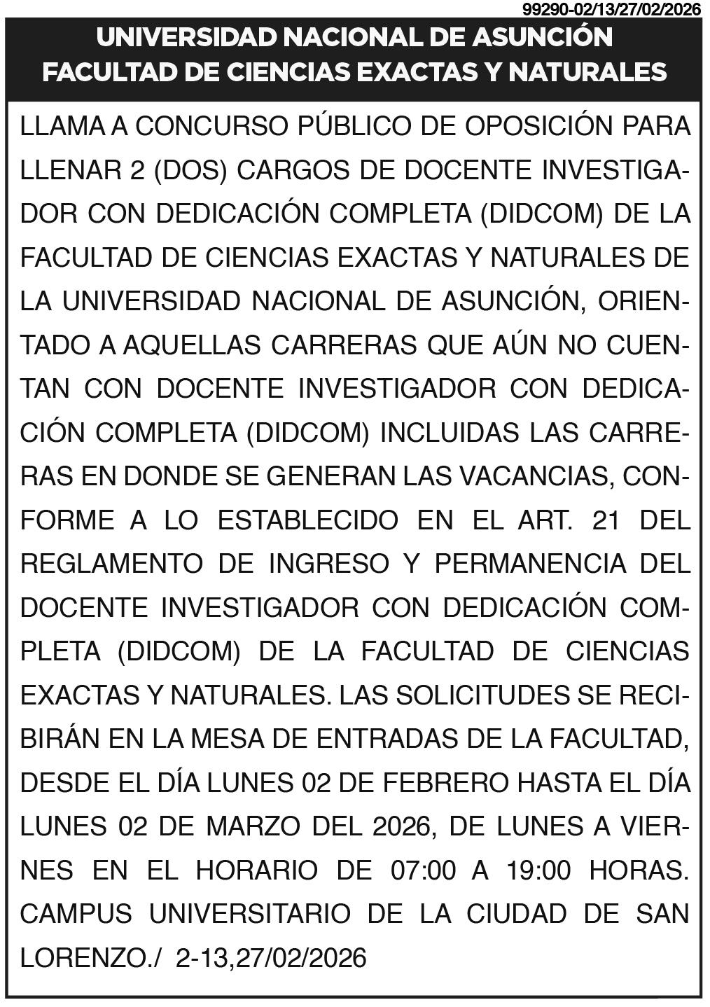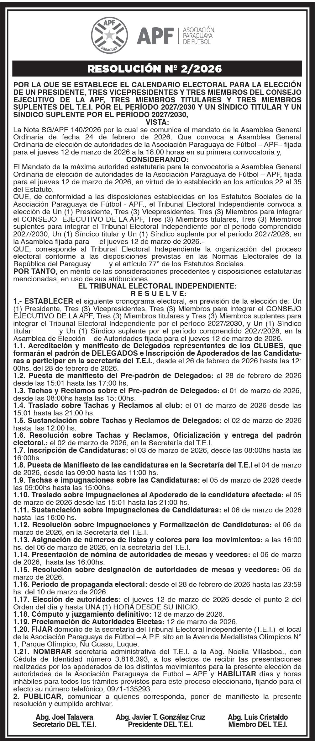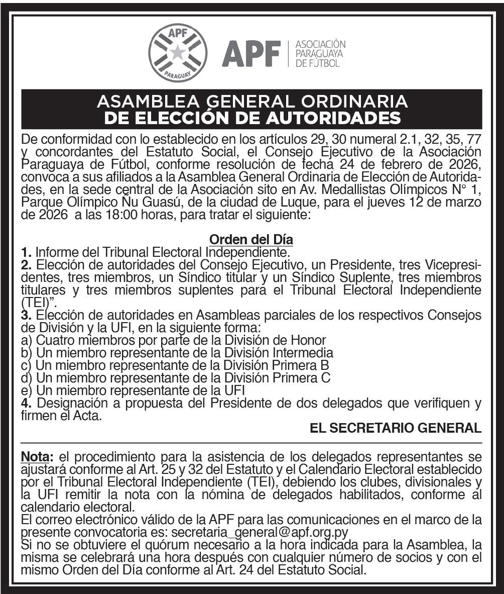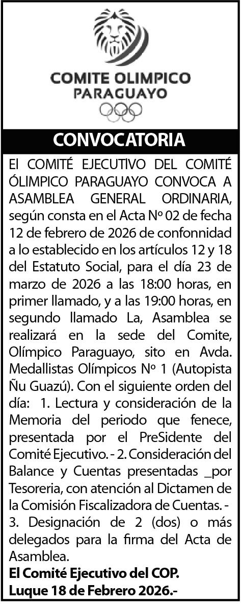 CONVOCATORIA A ASAMBLEA GENERAL ORDINARIA. la Junta Directiva del Círculo de Periodistas Deportivos del Paraguay (CPDP) convoca a los señores asociados, activos y vitalicios, a la Asamblea General Ordinaria, de acuerdo a lo establecido en el artículo 9.0 del estatuto del CPDP, para el sábado 28 de febrero del 2026, a las 07:00 hs. la primera convocatoria y 60 minutos después el segundo llamado, en la sede del hotel San Justo, ubicada en Sportivo Luqueño casi Moisés Bertoni, ciudad de Luque. ORDEN DEL DÍA: 1-Elección de un presidente y dos secretarios de Asamblea. 2-Consideración del acta de la Asamblea General Extraordinaria si se hubiese realizada con anterioridad. 3-Lectura y consideración de la memoria y el balance del ejercicio 2025. 4-Informe del síndico. 5-Asuntos varios. Asunción, 13 de febrero del 2026. La Junta Directiva./ 100347 -28/02/2026