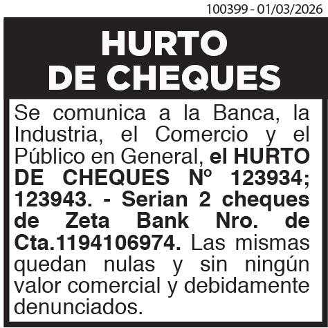 CONVOCATORIA A ASAMBLEA ORDINARIA. De acuerdo a lo que disponen los Artículos 24, 25, y 26 del Estatuto Social, se Convoca a Asamblea Ordinaria de Accionistas de la firma MERZIN S.A , RUC 80115237-2, para el día 10 de marzo de 2.026.- a las 14 hs, en su local comercial. Ubicado en Charles de Gaulle 155 e/ Mcal López y Quesada de la ciudad de Asunción.ORDEN DEL DIA 1- Designación de un secretario a suscribir el Acto Asambleario. 2- Decisión sobre las Reservas de los Ejercicios 2023-2024 3Designación de dos accionistas para suscribir el Acta. Se recuerda a los señores Accionistas que deberán proceder al Depósito de Acciones conforme al Estatuto Social para participar de la Asamblea. Asunción, 23 de febrero de 2.025-/ 100225 - 28/02/2026
