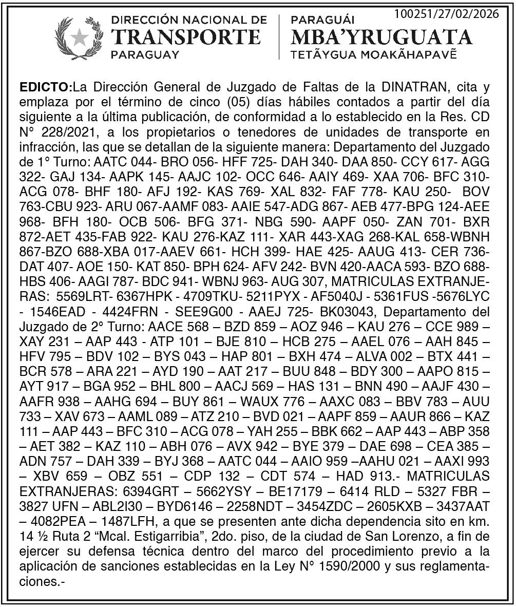 SUCESION. La Juez de Paz de la VI Circunscripción Judicial del Alto Paraná, con Asiento en el Distrito de Yguazú, Abg. María José Florentín Florentín, secretaría a cargo del Actuario Abg. Dionisio Ramón Alvarenga, Cita y emplaza por el término de sesenta (60) días, contados desde la publicación del presente edicto, comparezcan a deducir sus acciones contra el juicio caratulado “DELFIN CARDOZO BENITEZ s/ Sucesión Intestada. Exp. N° 113, Folio 9, Año 2025”, por sí o por apoderado a reclamarlo, cuyos trámites radican en este juzgado. Yguazu., 20 de febrero de 2026. Se hace saber al destinatario de este edicto que el mismo cuenta con el Código QR, por lo cual, para tener certeza de que este documento es válido, deberá utilizar el lector del Código QR, siendo ya en consecuencia, innecesaria la autenticación manual de la Actuaria del Juzgado conforme Acordada 1335/2019. 10038727/02 al 08/03