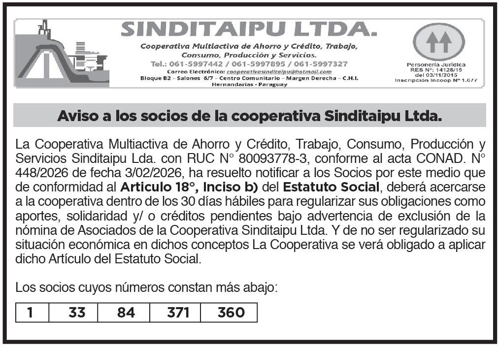 Limitada, en sesión extraordinaria de fecha 25 de febrero de 2026, según Acta Nº 781/2026, convoca a ASAMBLEA GENERAL ORDINARIA, de conformidad al Art. N° 52 Inc. a) del Estatuto Social, para el día domingo 22 de marzo del corriente, en el local del CENTRO EDUCATIVO PITIANTUTA, sito en Capitán Montiel esq. Julia Miranda Cueto de Estigarribia de la ciudad de Fernando de la Mora, con el siguiente orden del día: 1) Elección de Presidente y Secretario de Asamblea y designación de dos socios presentes, para suscribir el Acta de Asamblea. 2) Lectura del Acta de Asamblea anterior. 3) Lectura y Consideración de: Memoria del Consejo de Administración, Balance General, Cuadro de Resultados, Informe y Dictamen de la Junta de Vigilancia y de la Auditoría Externa del Ejercicio cerrado al 31 de Diciembre de 2025. 4) Propuesta de Distribución de Excedentes del Ejercicio 2025. 5) Estudio y Consideración del Plan General de Trabajo y Presupuesto para el Ejercicio 2026. 6) Fijación de Tasa inicial para ingreso de nuevos socios. 7) Autorización para endeudamiento externo y fijación de límites. 8) Autorización de aumento de dietas para dirigentes de los órganos administrativos de la Cooperativa. 9) Informe del Tribunal Electoral Independiente. 10) Elección parcial y renovación de Miembros del Consejo de Administración, Junta de Vigilancia y Tribunal Electoral Independiente. · 1ra. Convocatoria……08:30 Hs. · 2da. Convocatoria……09:00 Hs. IMPORTANTE: Se recuerda a todos los socios que deben estar al día con sus obligaciones societarias y económicas, (Artículo 19 inc. c) y Artículo 60 del Estatuto Social). Así mismo que, si no se contare con el quórum legal a la hora de la primera convocatoria, la Asamblea se iniciará válidamente a la segunda convocatoria con cualquier número de socios presentes. CONSEJO DE ADMINISTRACIÓN./ 1004662/03/2026