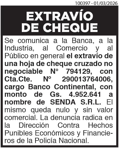 CONVOCATORIA DE ASAMBLEA ORDINARIA DE ACCIONISTAS DE LA FIRMA “CUIDEX PARAGUAY S.A.”. CON R.U.C. 80.117.706-5 A realizarse el día 13 de febrero del 2026 a las 10:00 horas en su local situado Avenida Silvio Pettirossi de la Ciudad de Luque, a los efectos de tratar los siguientes puntos Orden del Día. 1- Asignación de un Secretario de Asamblea. 2- Lectura y consideración de la memoria del Directorio, Balance General, Cuadro de Resultados e informe del Síndico correspondiente al ejercicio cerrado al 31 de diciembre de 2.025- 3- Designación del Presidente y Directores por 1 (un) año y del Síndico Titular y Suplente por 1 (un) año y sus remuneraciones- 4- Consideración del resultado del Ejercicio 2025- 5- Designación de un Accionista que deberá firmar el Acta de Asamblea conjuntamente con el Presidente y Secretaria- Se recuerda a los señores accionistas las previsiones establecidas en el Art. 7 de los Estatutos Sociales para poder asistir a la asamblea. Alicia Estela Vilasetru Representante Legal/- 100319 02/03/2026