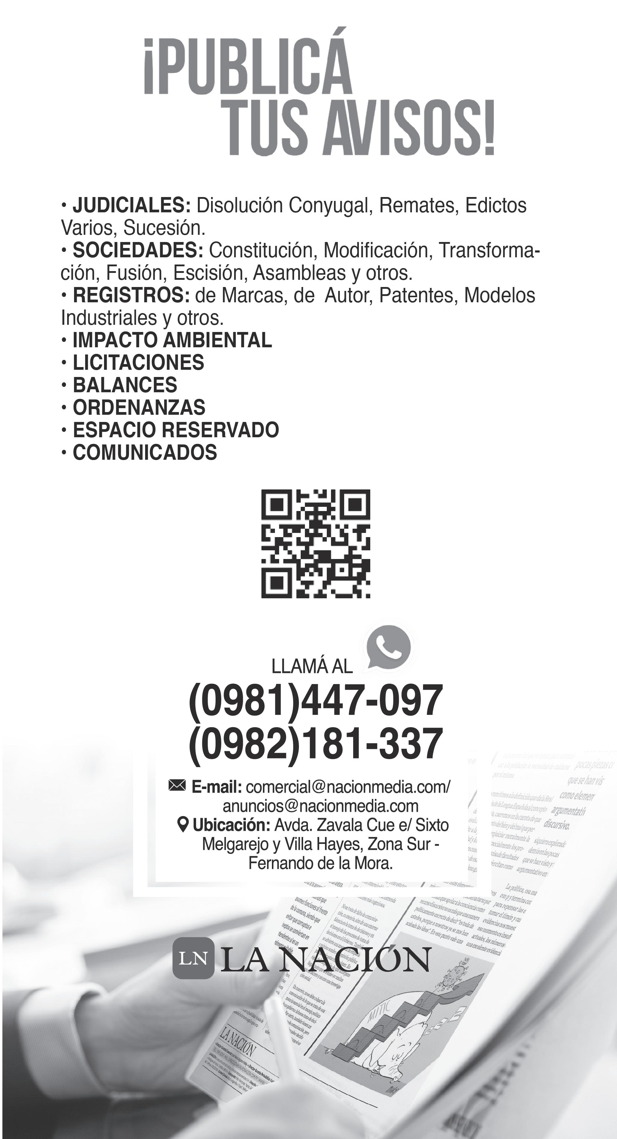 DISOLUCIÓN CONYUGAL. El Juez de Primera Instancia en lo Civil Comercial y Laboral del Tercer Turno e interino del Primer Turno de Cordillera, Dr. JUSTO CRISTINO RAMOS ARRUA, cita y emplaza por quince veces a los que tengan interés en reclamar derechos contra la Sociedad Conyugal formada por los esposos ALCIDES JAVIER FERREIRA SILVA Y ROMINA MARICE TORRES GONZALEZ, para que en el perentorio término de treinta (30) días, contados desde la publicación del presente edicto, comparezcan a deducir sus acciones, bajo apercibimiento de lo dispuesto en el Art. 55 de la Ley 1/92. El juicio radica en la Secretaría N° 2 a cargo de la Actuaria Abg. Sandra Elizabeth Busam Román. CAACUPE, 23 de Octubre de 2024 Se hace saber al destinatario de este documento que el mismo cuenta con el Código QR, por lo cual, para tener certeza de que este documento es válido, deberá utilizar el lector del Código QR, siendo ya en consecuencia, innecesaria la autenticación manual de la Actuaria del Juzgado conforme Acordada 1.335/2019 de la Corte Suprema de Justicia. –99871-02/03/2026