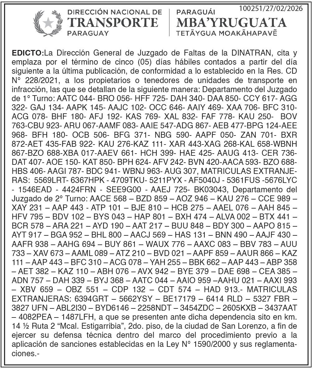 S.A. Convoca a Asamblea General Ordinaria para el 20/03/2026 a las 11:00 horas, en primera convocatoria, en la Av. Aviadores del Chaco esq. Molas López, Asunción, para tratar el siguiente: ORDEN DEL DÍA 1. Designación del Secretario de Asamblea. 2. Designación de nuevos miembros del Directorio. 3. Designación de dos accionistas para suscribir el Acta de Asamblea. EL DIRECTORIO/ - 100243 -1/03/2026/