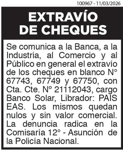 Observación: Se recuerda a los Señores Accionistas que para poder participar en la Asamblea deberán depositar las acciones o certificados bancarios en la sede social de conformidad al Artículo 1084 del Código Civil. Asunción, 09 de Marzo de 2026. EL Directorio 100808- 7 al 11/03