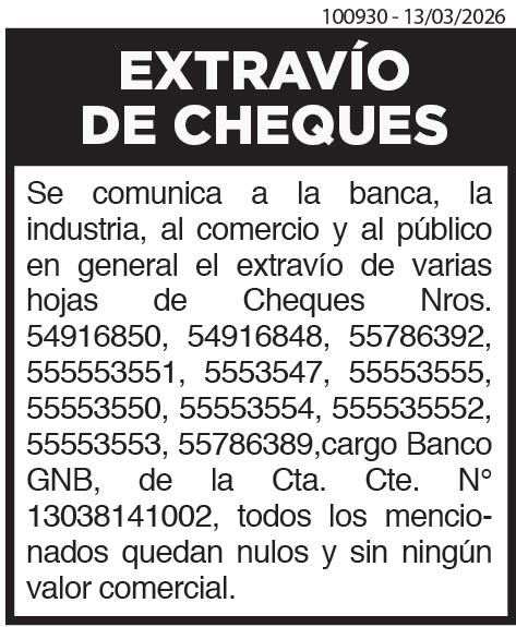 Ruta Ñ Ltda., llama a sus asociados a Asamblea General Extraordinaria, a realizarse el día Martes, 24 de Marzo de 2026 a las 18:00 horas, en su primera convocatoria, en el local de Carmen Soler 3933 casi Radio Operadores del Chaco, con el siguiente Orden del Día: 1-Préstamo para adquisición de un lote grande de crucetas de polímeros. 2-Tarifa de la energía eléctrica, a partir del 01-042026. 3-Autorización para la adquisición de un inmueble en la Ruta Ñ. NP Rosa Etcheverry de Brizuela Secretaria, Dr. Atilio R. Fernández, Presidente Nota: Conforme al artículo 51 del Estatuto Social. “Ausencia de Quórum Legal. En caso de que a la hora y día fijado en la convocatoria, no se llegare a reunir el quórum legal conforme al artículo anterior, pasada una hora se celebrará válidamente, con cualquier número de delegados/as presentes”. RESOLUCIÓN INCOOP Nº 099 19/05/2004 – INSCRIPCIÓN Nº 859./ 100783-11/03/2026