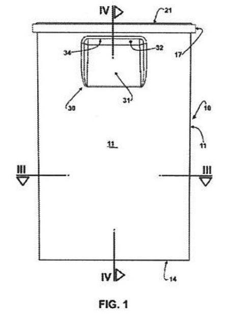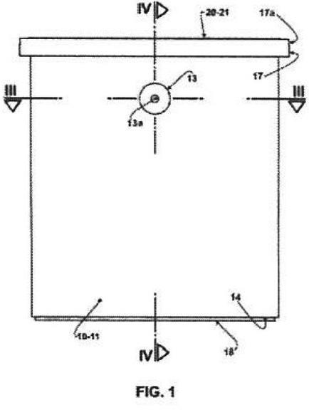la tapa (20) un borde periférico (21) en forma de "U" invertida, para ser encajado y bloqueado sobre el borde superior (15) del cuerpo (1O) y con una pata externa (21b) encajada dentro del canal en forma de "U" (16a). Dirección de Patentes. Farm. Berta Segovia. 100886 -14/03/2026