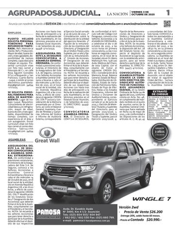 dos Accionistas que deberán firmar el Acta de la Asamblea, conjuntamente con el Presidente y el Secretario. NOTA: Se recuerda a los señores Accionistas que para tener derecho a participar de la Asamblea, deberán efectuar el depósito de sus respectivas Acciones con hasta tres días de anticipación a la fecha de la realización del acto Asambleario, en los términos previstos en el Estatuto Social. Asunción, 11 de Setiembre de 202594438 -3/10/20525