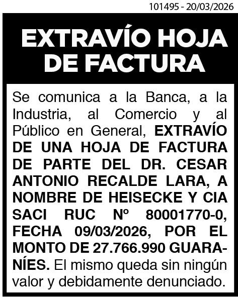 CONVOCATORIA DE ASAMBLEA ORDINARIA DE ACCIONISTAS DE LA FIRMA “AMARO S. A.”. CON R.U.C. 80.046.032-4 A realizarse el día 31 de marzo del 2026 a las 09:00 horas en su local situado en Valeriano Zeballos e/ Maestro Félix y Mcal. Estigarribia de la ciudad de Luque, a los efectos de tratar los siguientes puntos Orden del Día. 1- Asignación de un Secretario de Asamblea. 2- Lectura y consideración de la memoria del Directorio, Balance General, Cuadro de Resultados e informe del Síndico correspondiente al ejercicio cerrado al 31 de diciembre de 2.025. 3- Designación de Presidente y Director por 1 (un) año y del Síndico Titular y Suplente por 1 (un) año y sus remuneraciones. 4Consideración del Resultado del Ejercicio 2025. 5Designación de un Accionista que deberá firmar el Acta de Asamblea conjuntamente con el Presidente y Secretaria. Se recuerda a los señores accionistas las previsiones establecidas en el Art. 17 de los Estatutos Sociales para poder asistir a la asamblea. Wilfrido Serna Representante Legal/ 10132421/03/2026