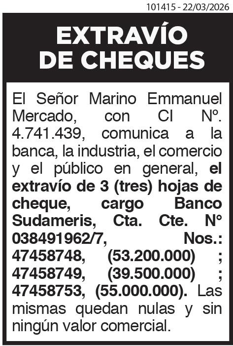 accionistas que, conforme lo dispone el art. 1084 del Código Civil, deberán depositar en la sociedad sus acciones o un certificado bancario de depósito a nombre del Accionista con anticipación de por lo menos tres días hábiles previos a la fecha de la Asamblea, para su registro en el libro de asistencia a la asamblea. Asunción, 17 de marzo de 2026 El Directorio. 101322-21/03/2026