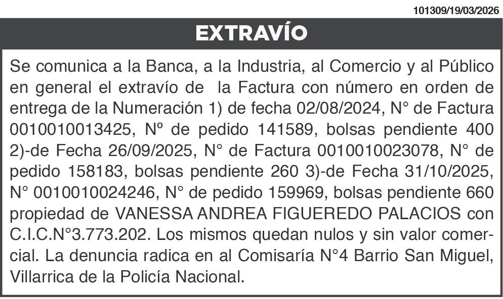 VILLALBA. (Actuaria Judicial – Secretaría N° 01- Abg. Rodney González). Se hace saber al destinatario de este edicto que el mismo cuenta con el Código QR, por lo cual, para tener certeza de que este documento es válido, deberá utilizar el lector del Código QR, siendo ya en consecuencia, innecesaria la autenticación manual de la Actuaria del Juzgado conforme Acordada 1366/201.PRESIDENTE FRANCO, 10 de Marzo de 2026. 101302- 17 al 26/03