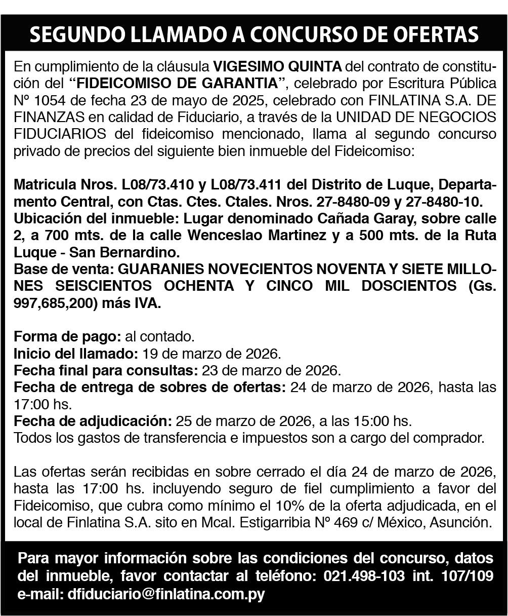 medio a todos los accionistas a participar de la Asamblea General Ordinaria a realizarse el día viernes 10 de abril de 2026 a las 08:30 horas en primera convocatoria y 09:30 horas en segunda convocatoria, en el local social, situado en la Av. Mariscal José Félix Estigarribia e/ Los Mingueros y Ma. Auxiliadora, Minga Guazú para tratar el siguiente orden del día: 1-Elección de un presidente y un secretario de asamblea. 2-Consideración de los estados financieros correspondiente a los ejercicios cerrados al 31 de diciembre del 2024 y 2025, con sus anexos, así como el informe del síndico y memoria del directorio. 3-Consideración del resultado correspondiente a los ejercicios cerrados al 31 de diciembre del 2024 y 2025. 4-Designación de un Síndico Titular y Suplente para el periodo 2026 y fijación de su remuneración. 5-Designación de Directores Titulares y Suplentes para el periodo 2026 y fijación de sus remuneraciones. 6-Designación de accionistas para suscribir el acta de asamblea. Se recuerda a los señores accionistas dar cumplimiento a lo establecido en el Art. 21 del Estatuto Social para ejercer sus derechos en la asamblea. EL Directorio 101334- 17 al 21/03