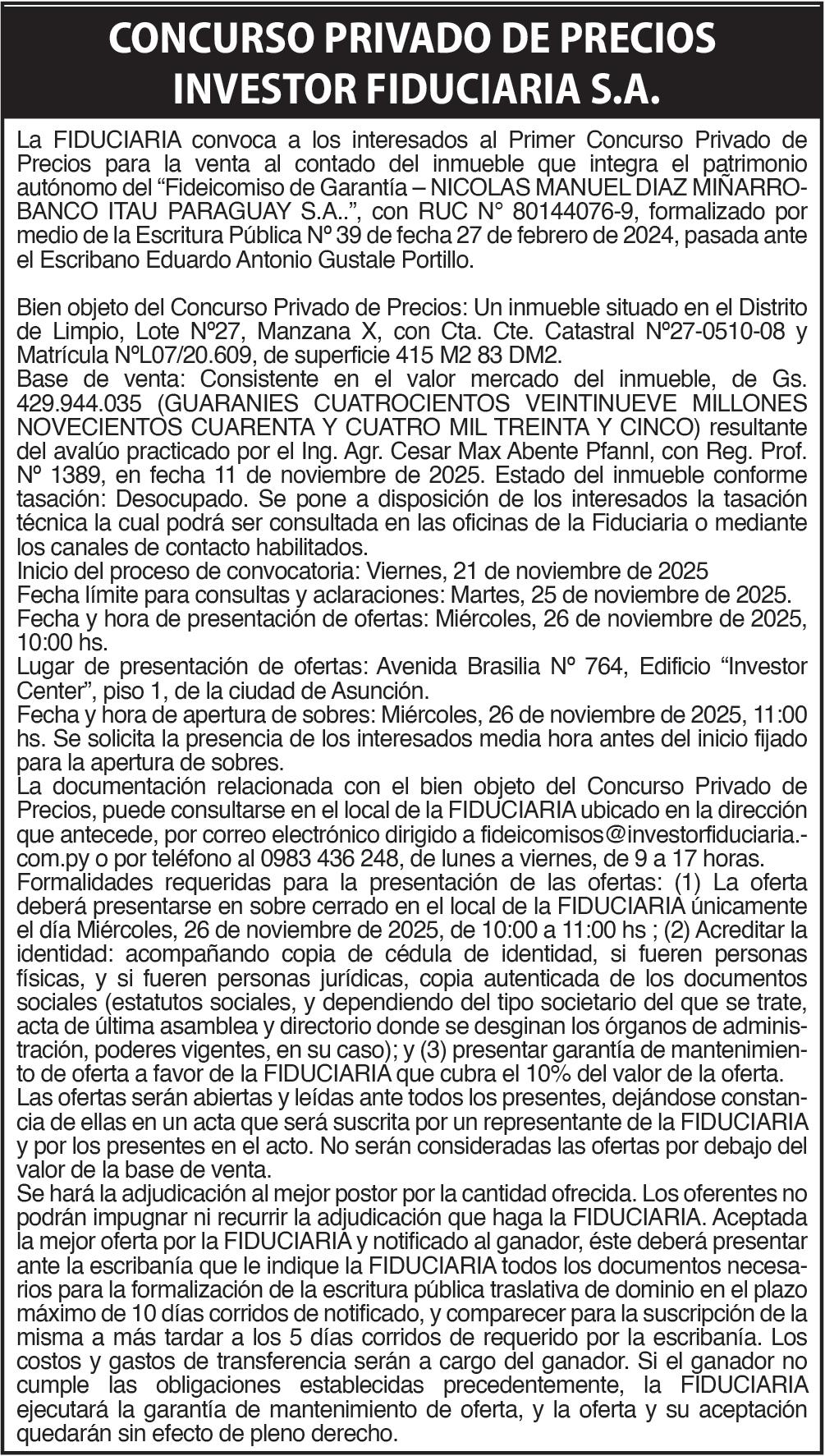 nandarias, Departamento del Alto Paraná, Duración: 99 años. Objeto principal Desarrollo inmobiliario mediante la compraventa o locación de inmuebles urbanos y/o rurales, realización de servicios de intermediación, administración de bienes propios y/o de terceros Incluyendo consorcios de propietarios de propiedad horizontal; Capital Social Suscripto e integrado: Guaraníes Treinta y Tres Mil Millones (Gs.33.000.000.000); Inscripción D.G.R.P. Personas Jurídicas y Comercio, Matrícula Nº 47.185, Serie Comercial, bajo el Nº 1, Folio 1/19, en fecha 07/11/2025. 96830- 21 al 23/11